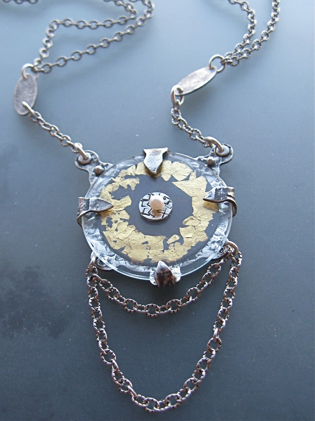 Copper, sterling silver, stick pearl bead, lab grown ruby crystal (bought mannnny years ago). Fabricated.
